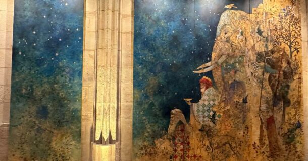 Sur un fond de ciel étoilé, les mages, de profil, s’inclinent et présentent leurs offrandes, accompagnés de tout un ensemble de pages, de soldats, d’éléphants, de chameaux et d’animaux divers. Au sommet de cet amas limpide et touffu, on distingue même les murailles d’une ville : dans cette composition en escalier, c’est en réalité la Création toute entière qui vient s’agenouiller devant … Devant qui, au juste ? Devant son Créateur, bien sûr, sous les espèces de l’enfant-Dieu qui vient de naître. Mais le peintre fait en sorte que tout d’abord on ne l’aperçoive pas, isolé à même le sol, sous un petit arc rouge et blanc, dans un tableau séparé, presque imperceptible face à la profusion du monde qui vient lui rendre hommage : l’enfant ne montre que son humilité et c’est la magnificence du cortège des mages qui, elle, révèle ce que cette humilité dissimule de puissance infinie.