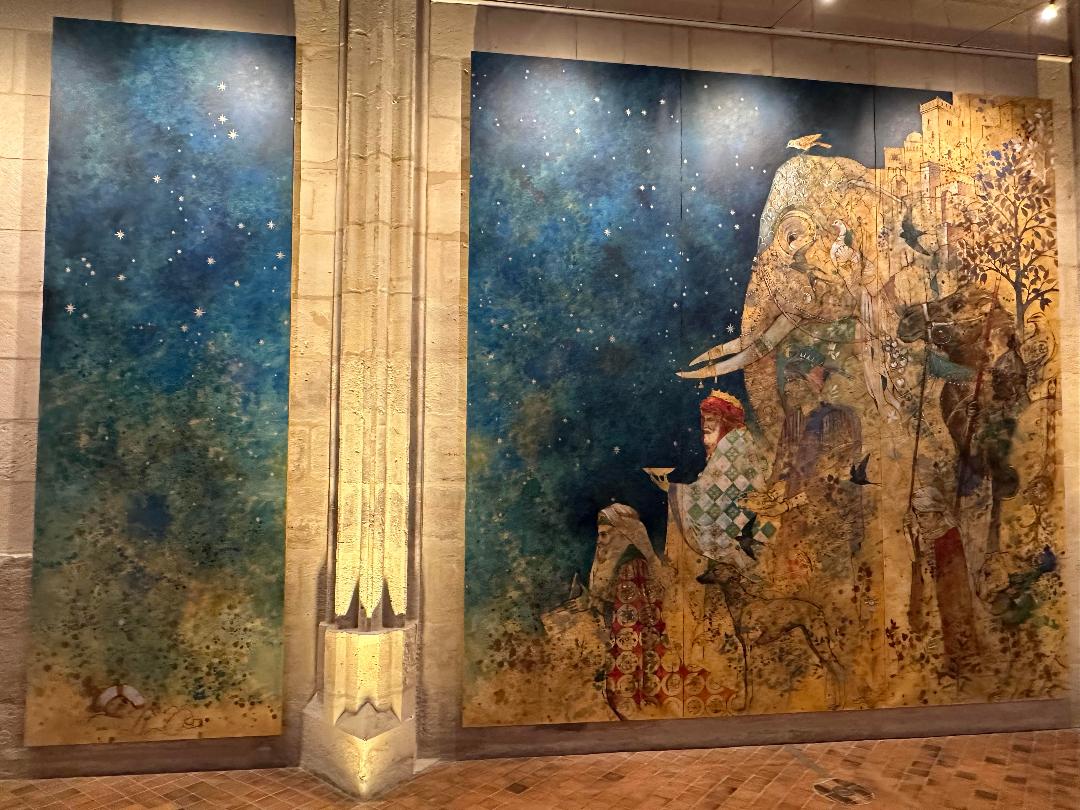 Sur un fond de ciel étoilé, les mages, de profil, s’inclinent et présentent leurs offrandes, accompagnés de tout un ensemble de pages, de soldats, d’éléphants, de chameaux et d’animaux divers. Au sommet de cet amas limpide et touffu, on distingue même les murailles d’une ville : dans cette composition en escalier, c’est en réalité la Création toute entière qui vient s’agenouiller devant … Devant qui, au juste ? Devant son Créateur, bien sûr, sous les espèces de l’enfant-Dieu qui vient de naître. Mais le peintre fait en sorte que tout d’abord on ne l’aperçoive pas, isolé à même le sol, sous un petit arc rouge et blanc, dans un tableau séparé, presque imperceptible face à la profusion du monde qui vient lui rendre hommage : l’enfant ne montre que son humilité et c’est la magnificence du cortège des mages qui, elle, révèle ce que cette humilité dissimule de puissance infinie.