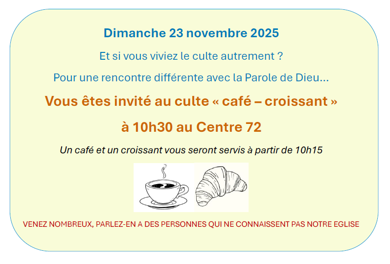 Dimanche 23 novembre 2025, nous vous invitons à un culte différent des cultes classiques. Nous vous convions à un culte « café – croissant » que nous espérons particulièrement chaleureux et très convivial.